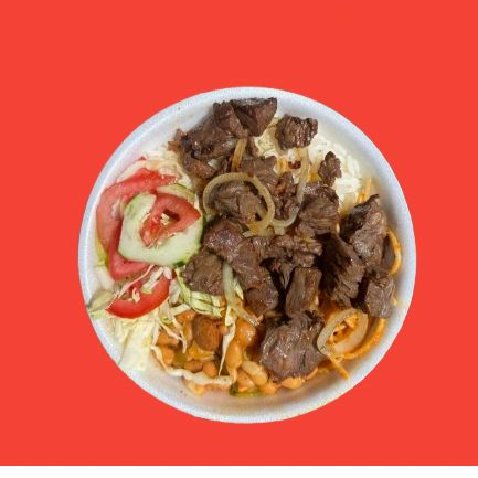 ARROZ, FEIJÃO, FILE DE CARNE, FEIJÃO E SALADA