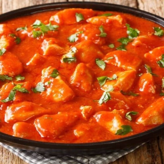 Porção de aproximadamente 1kg de frango fatiado com cebola ao molho curry