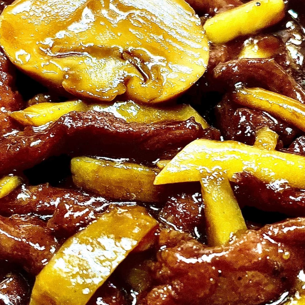 Porção de aproximadamente 450g de carne desfiada com champignon e broto de bambu + porção de aproximadamente 400g de arroz chop suey (arroz,cebolinha, cenoura, ovo e presunto) + 1 refrigerante lata 350ml