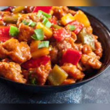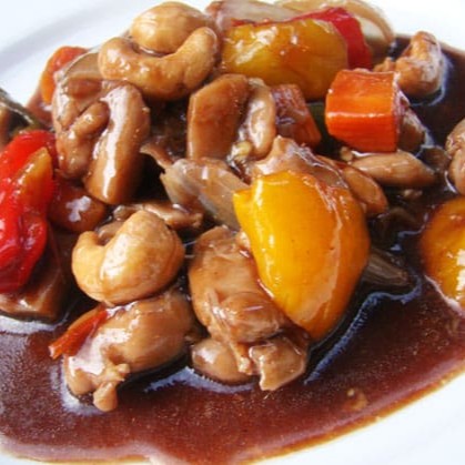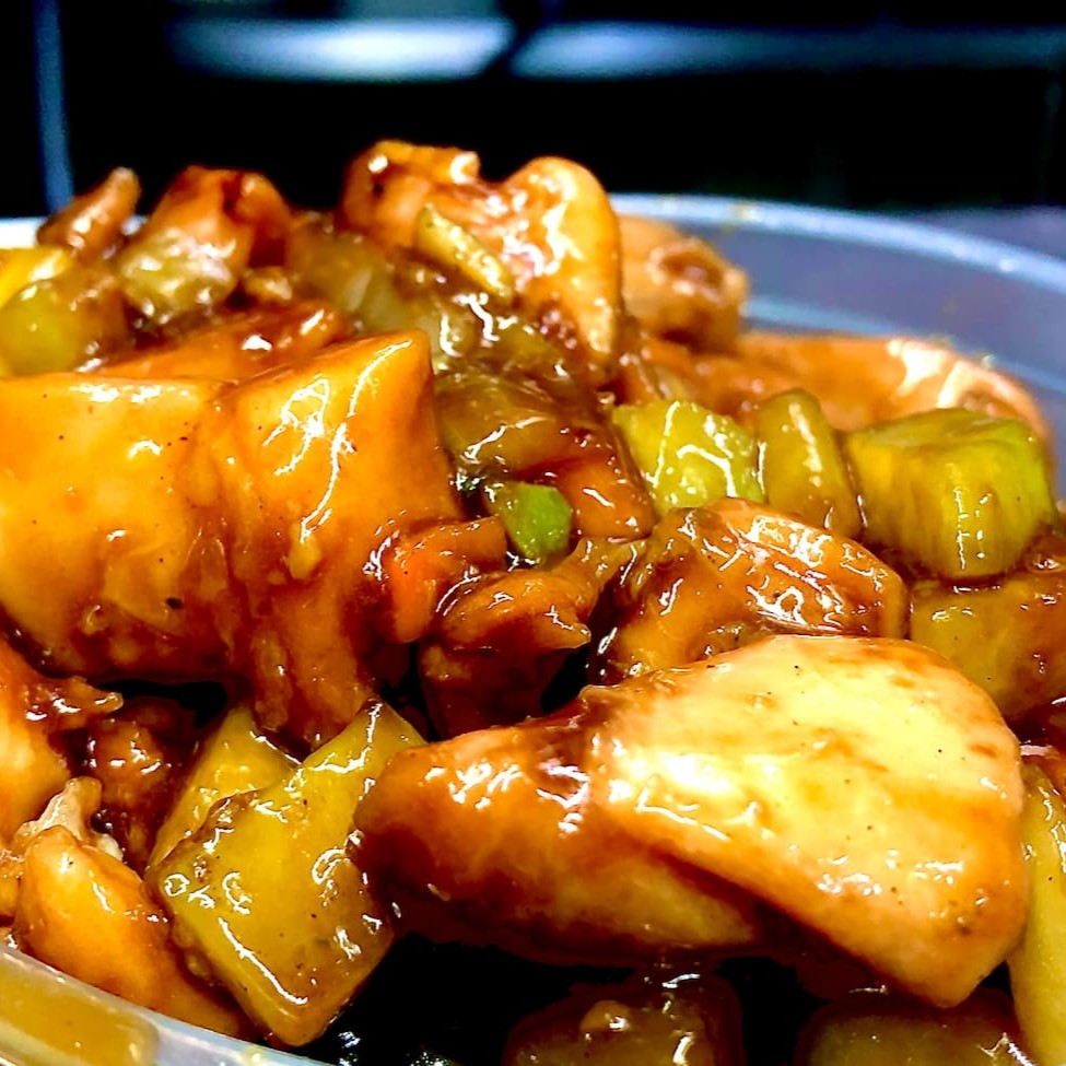 Porção de aproximadamente 1 kg de frango xadrez ao molho especial (sem legumes).