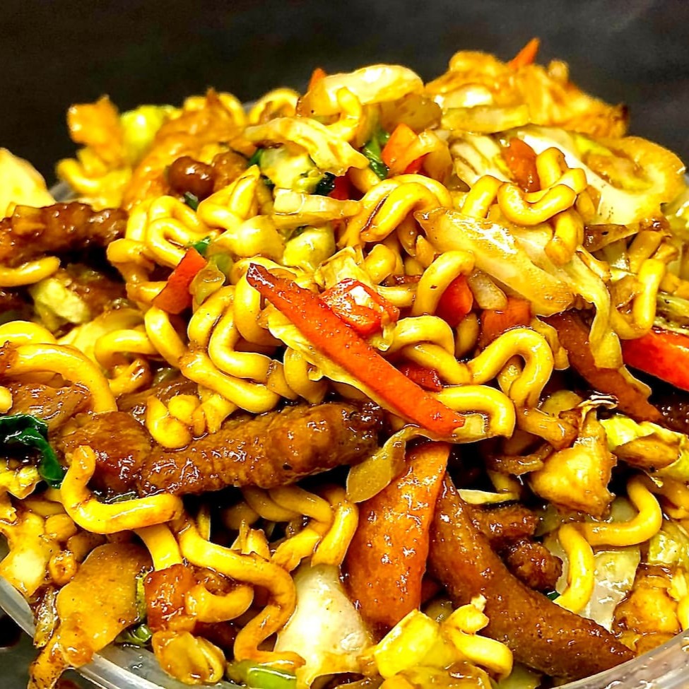 Porção de aproximadamente 450g de yakisoba misto (macarrão, carne, frango e legumes) + 1 refrigerante lata