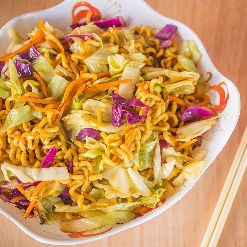Porção de aproximadamente 1kg de yakisoba com legumes (repolho verde, repolho roxo, cenoura, cebola, couve folha)