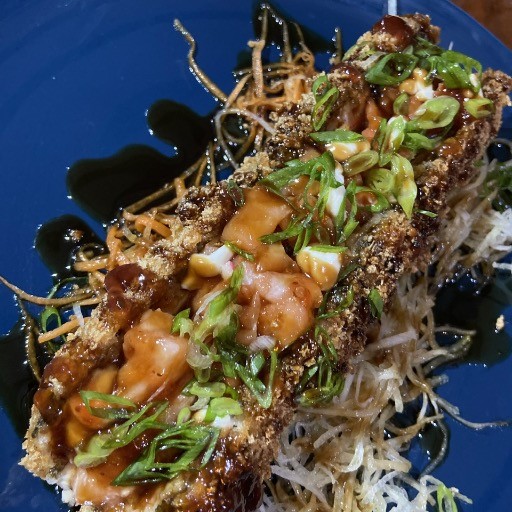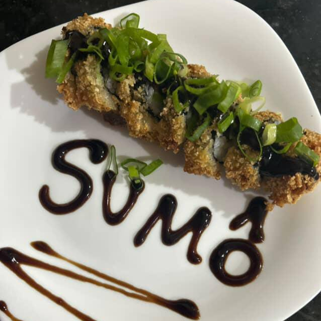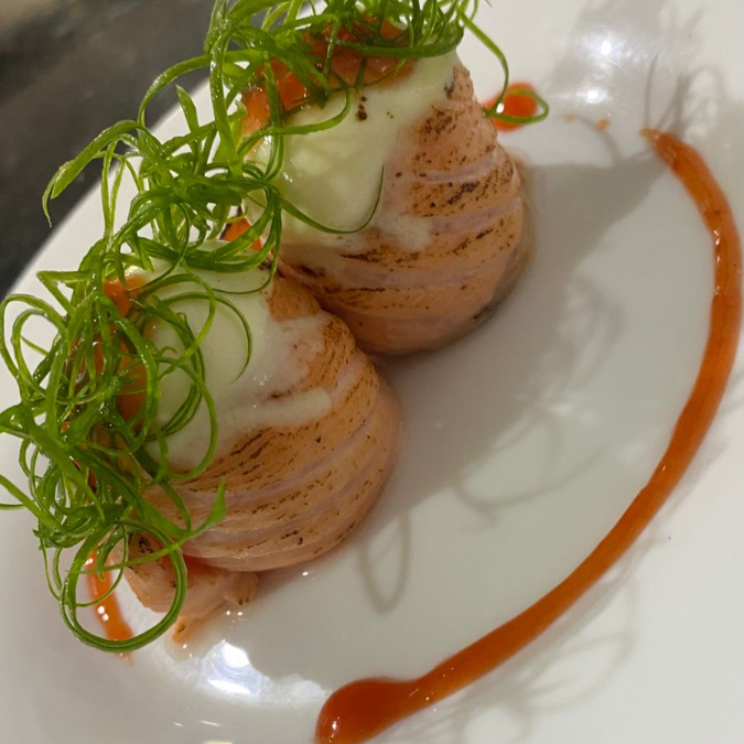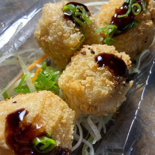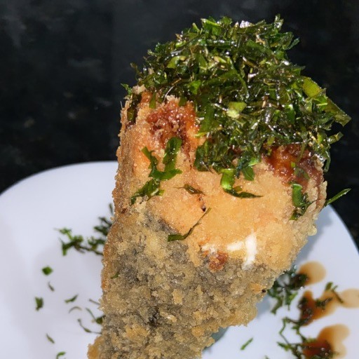 Uma criação do nosso Chef. Silvio Trindade: Bolinho japonês com arroz, salmão, kani e cream cheese, empanado e frito.