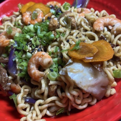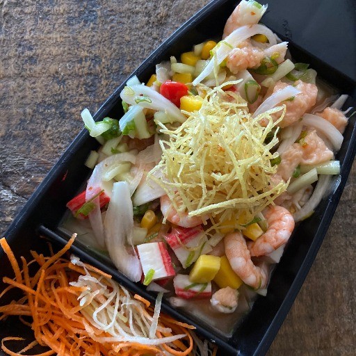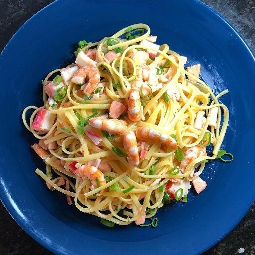 Massa tipo Fettuccine gran duro refogado, no azeite de ervas com lula, camarão, salmão, kani e cebolinha.