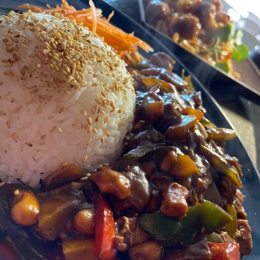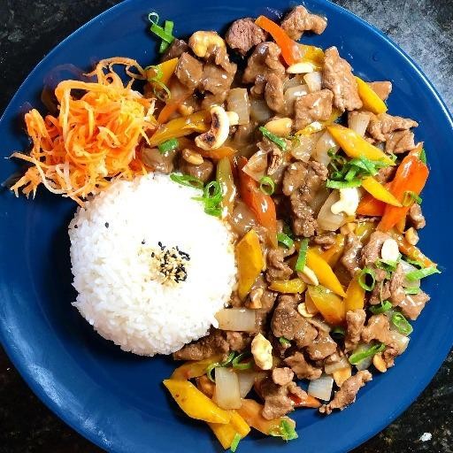 Carne em cubos refogado no shoyu, com pimentões, cebola, castanha e amendoim, acompanhado de arroz.