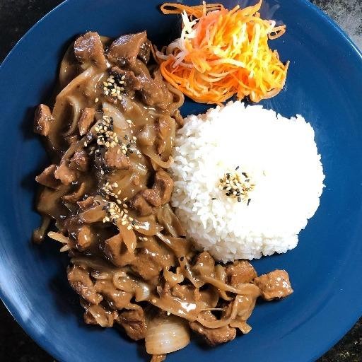 Carne em cubos flambados no sake e shoyu com cebola, acompanhado de arroz.