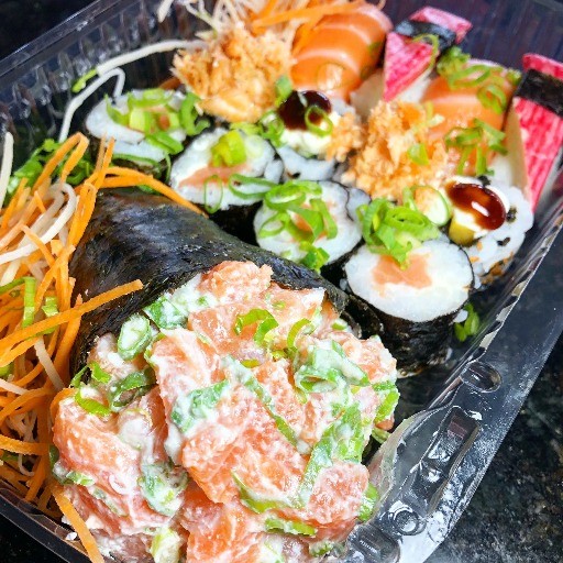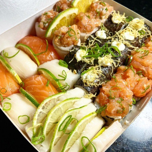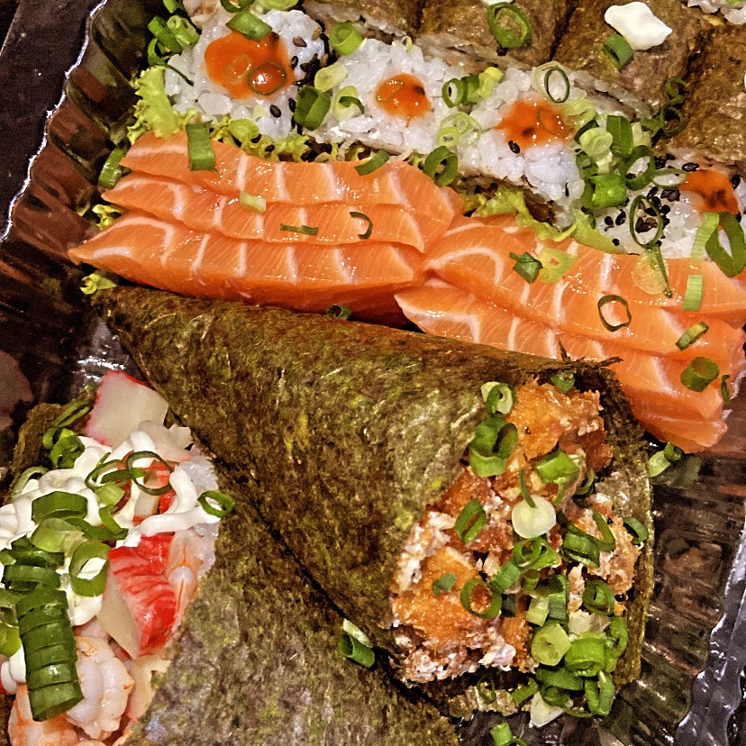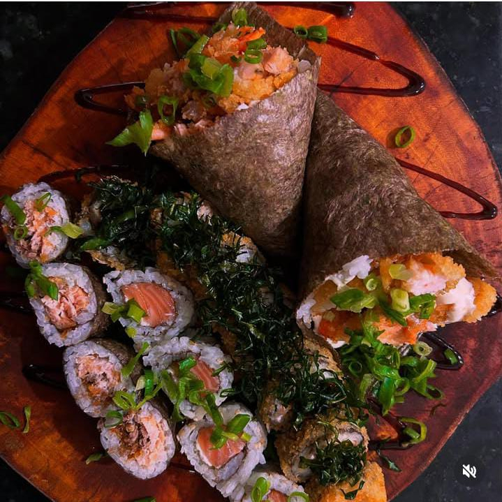 8 uramaki, 5 hossomaki, 6 sashimi e 2 temaki salmão frito.
