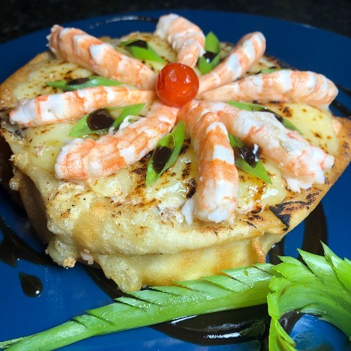 Batata rosti frita, salmao cozido, queijo maçaricado. ( tamanho de uma Pizza Brotinho)