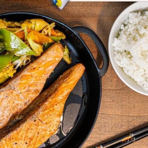 Lâminas de salmão grelhado, acompanhado com arroz e legumes salteados (cenoura, pimentão, cebola, repolho verde e repolho roxo).