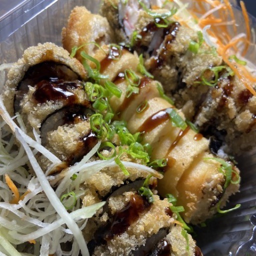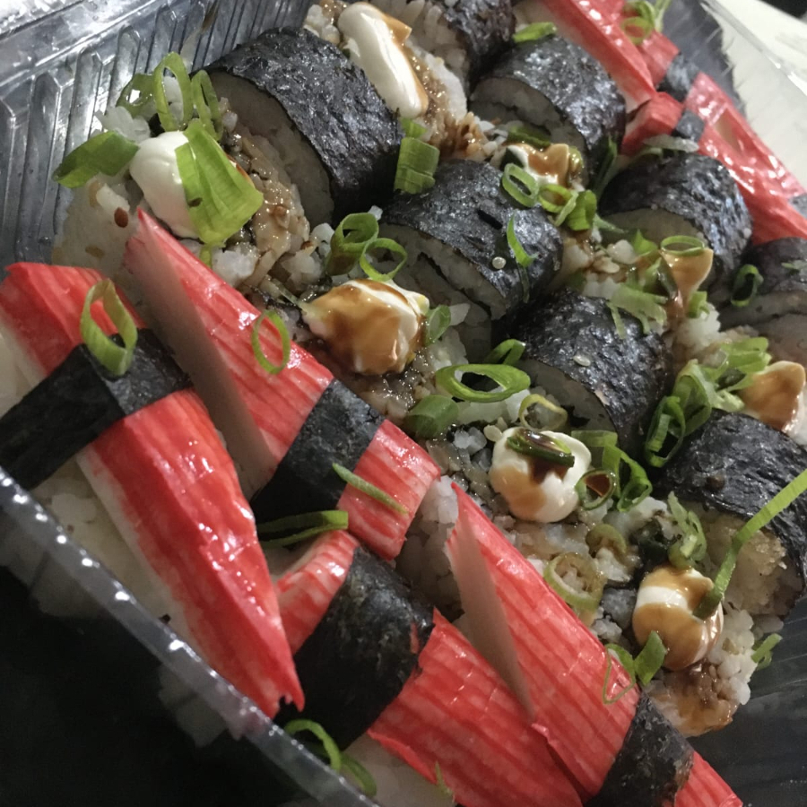 nori envolto do arroz, gengibre, alface, pepino, molho teriaki e cream chess