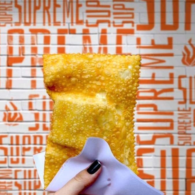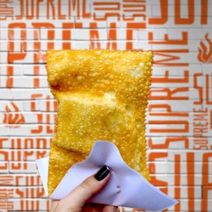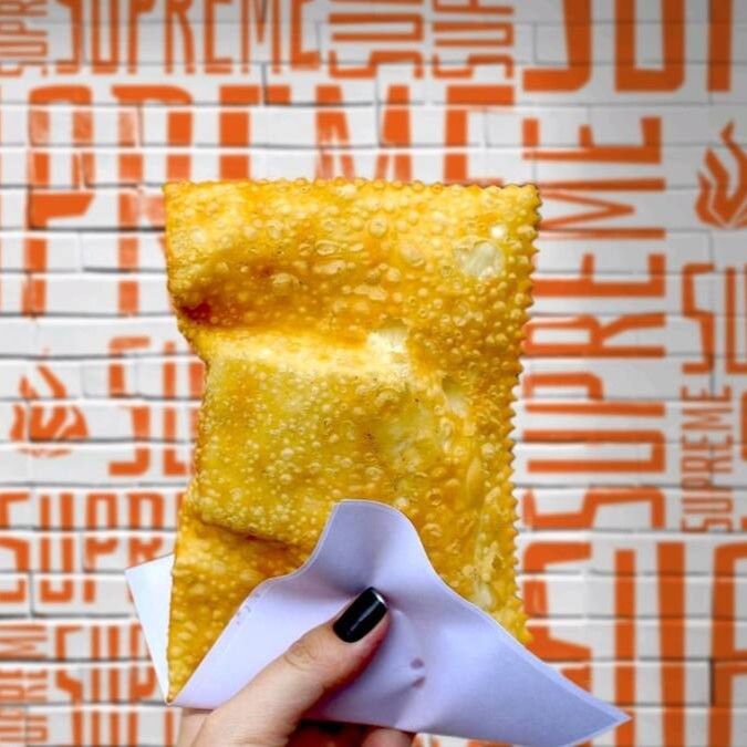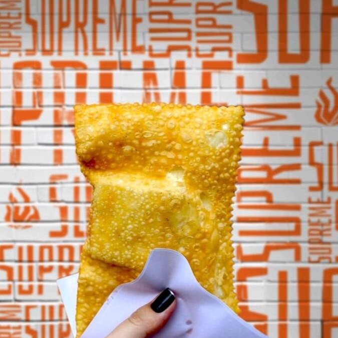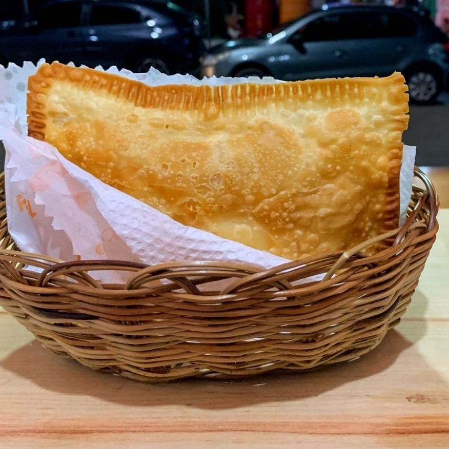 Pastel recheado de Frango, presunto, Queijo mussarela e Catupiry