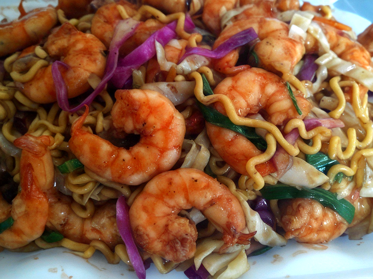 Macarrão, camarão e legumes (repolho verde, repolho roxo, cenoura, couve, cebola picada).