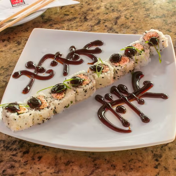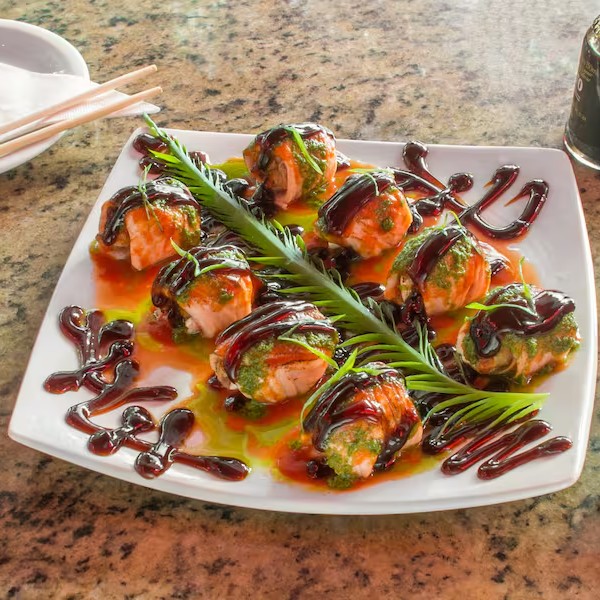 Uramaki envolto de salmão com camarão empanado cream cheese ,cebolinha e teriaki