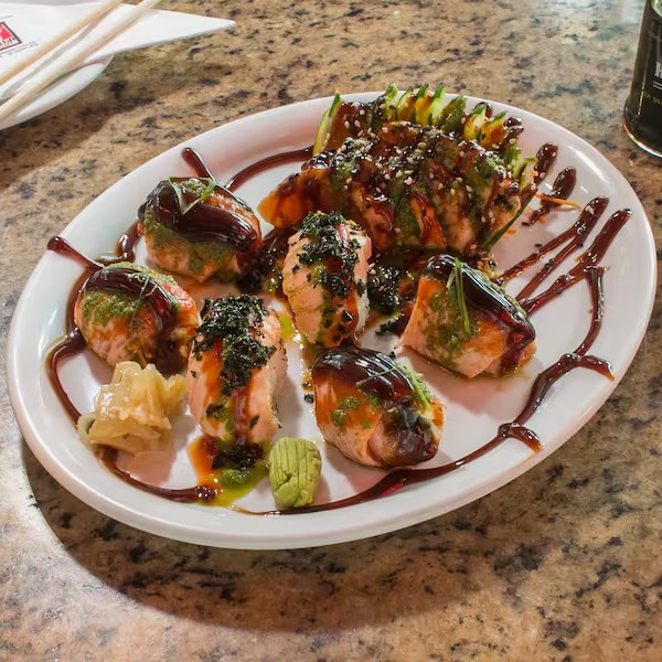 Salmão maçaricado, cream cheese, camarão empanado e molho especial