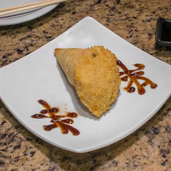 Alga, arroz, camarão empanado, com cream cheese e cebolinha.