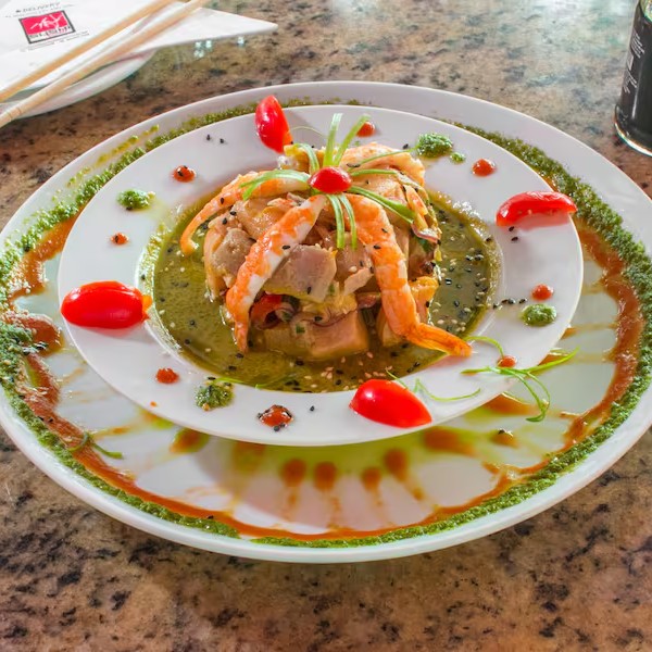 Cubos de peixes c camarão e cebola marinado c molho picante especial