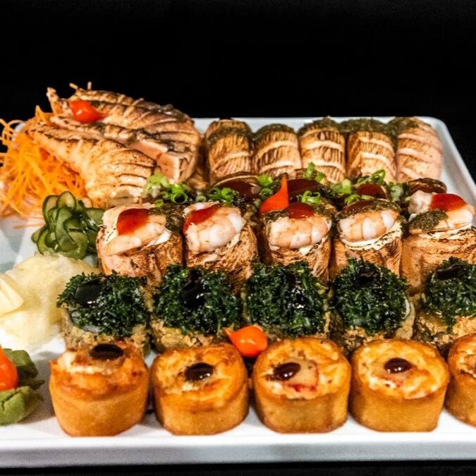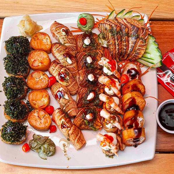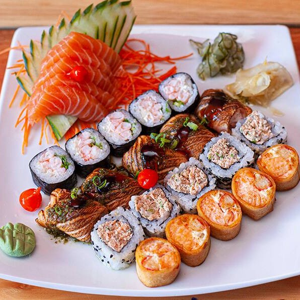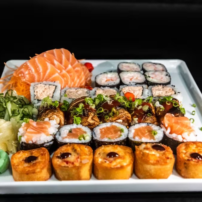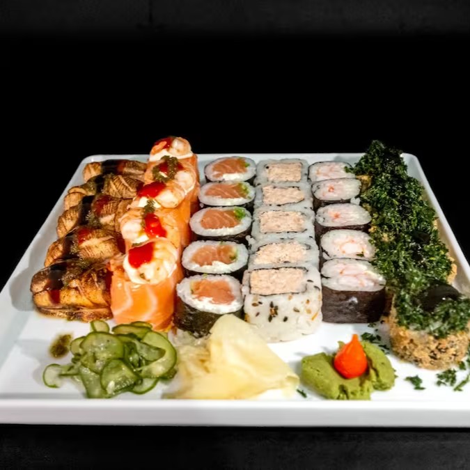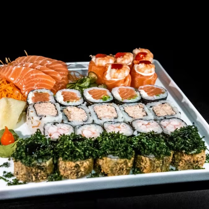 7 sashimis de salmão, 7 especial imperium, 7 jyo camarão, 7 acelga maki, 10 hot holl, 10 shake couve, 2 niguiri de salmão, 5 hossomaki de camarão e 5 uramaki de salmão grelhado.