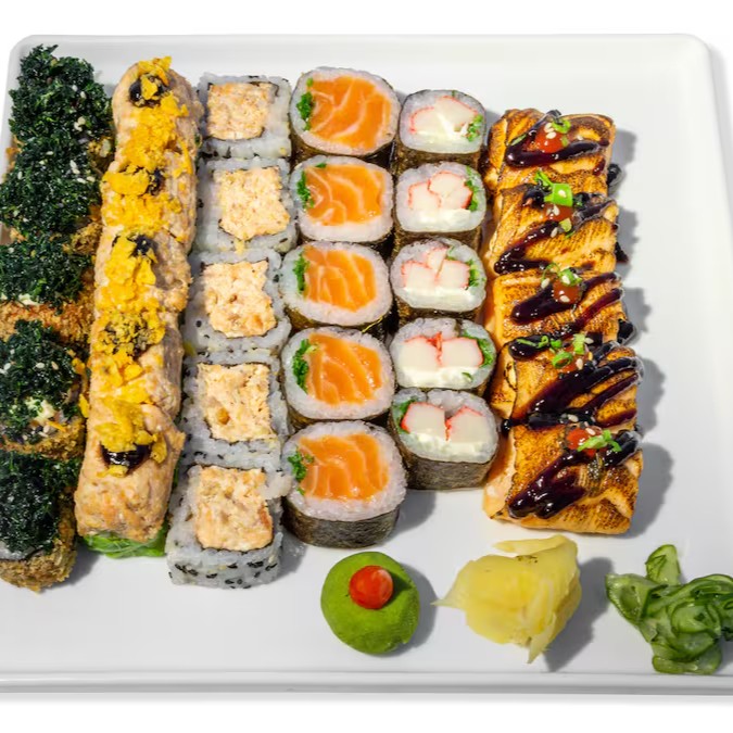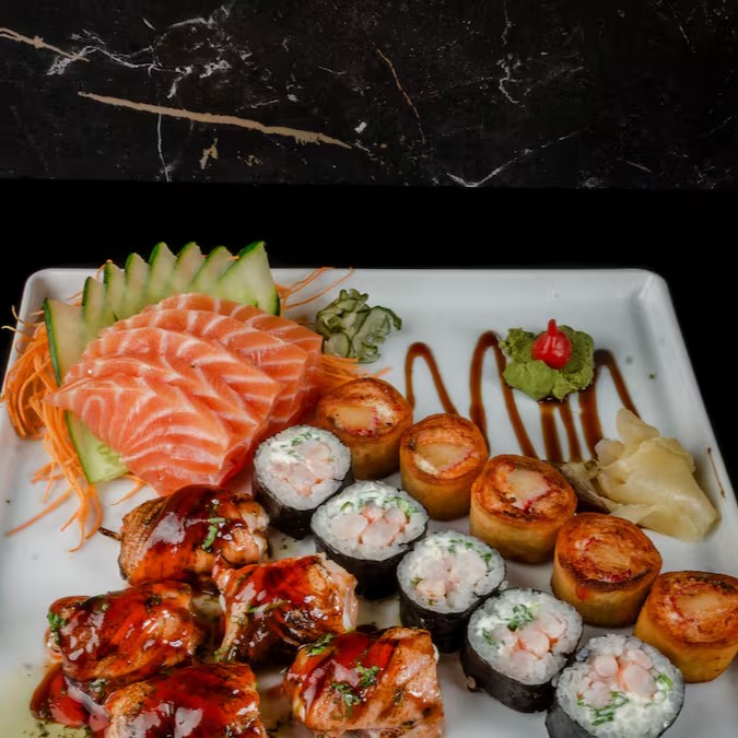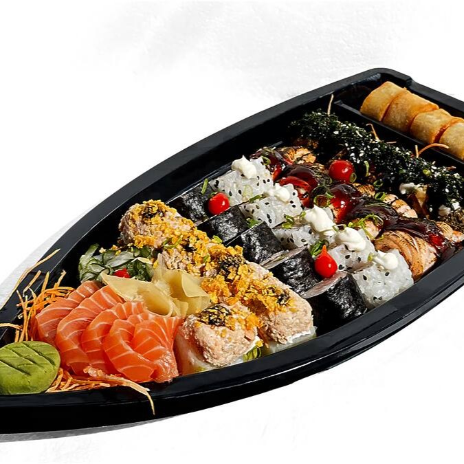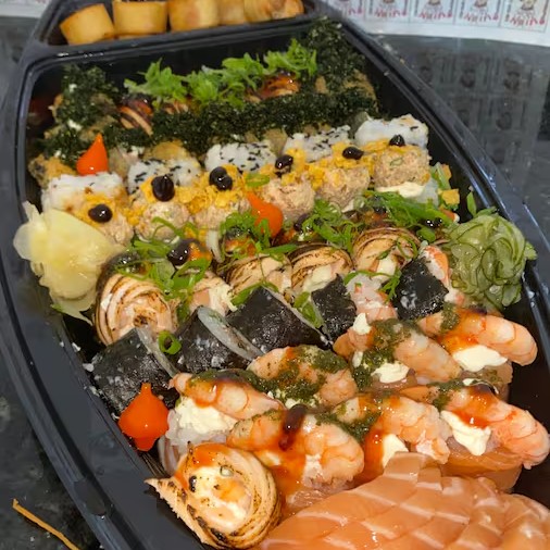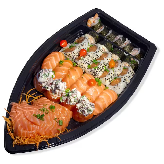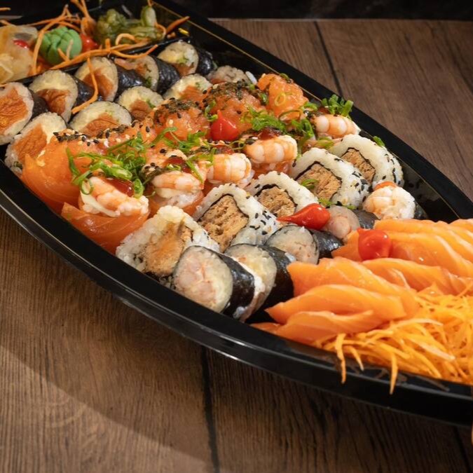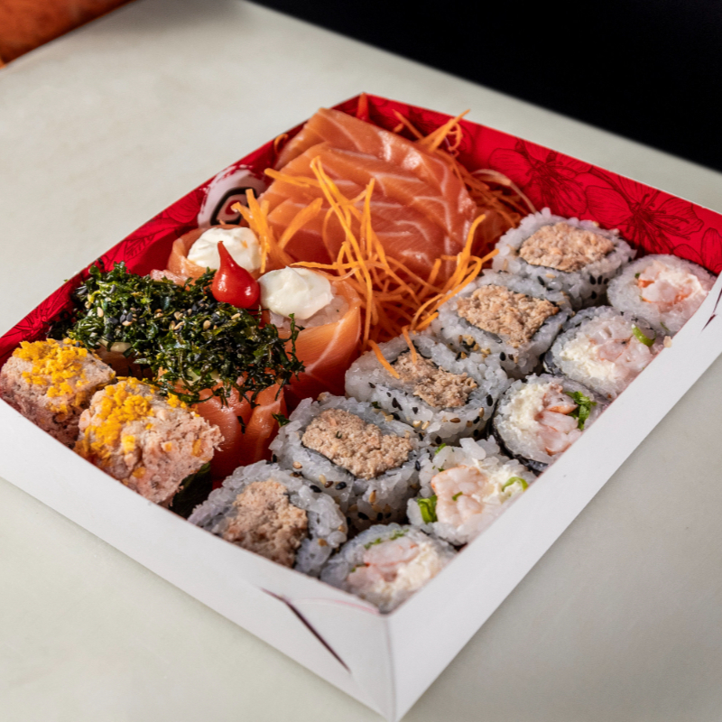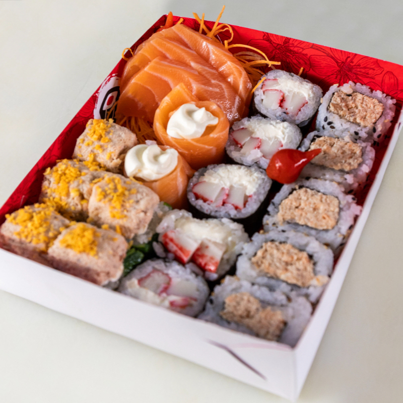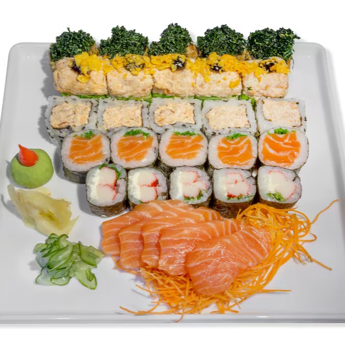 10 sashimis, 5 hossomaki de camarão, 5 uramaki shake grill, 5 jyo camarão, 5 jyo salmão, 10 philadelphias