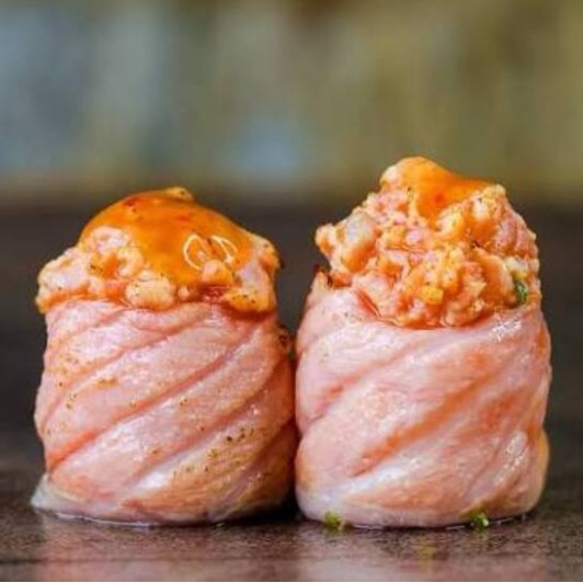 8 Sashimis Salmão, 5 Joe Salmão Cru e Maçaricão, 5 Neguiris Salmão Cru e Maçaricados, 10 Hossomaki Salmão, 10 Uramaki Salmão, 4 Hot Roll + 2 temaki Salmão