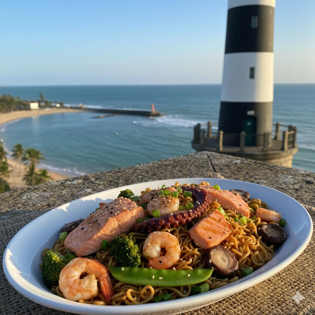 MACARRÃO ARTESENAL, ACOMPALHADO COM FILÉ DE CAMARÃO / SALMÃO / POLVO, LEGUMES FRESCOS E MOLHO DO CHEF.