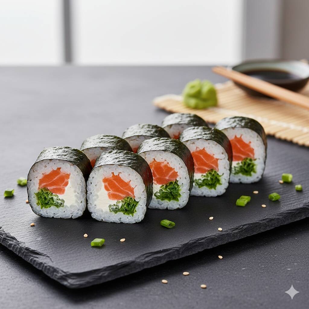 NORI COM ARROZ REVESTIDO COM SALMÃO GRELHADO, CEBOLIINHA E CREAM CHEESE.