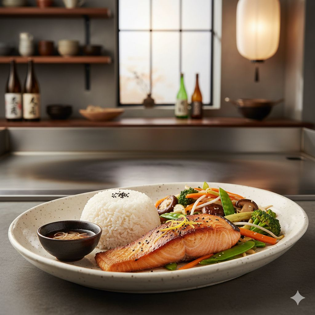 SALMÃO GRELHADO COM ESPECIARIAS, LEGUMES REFOGADOS NA MANTEIGA E GOHAN.