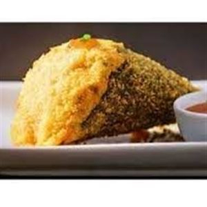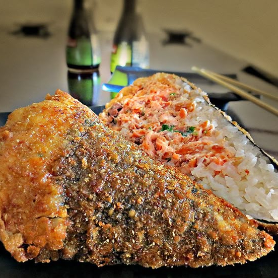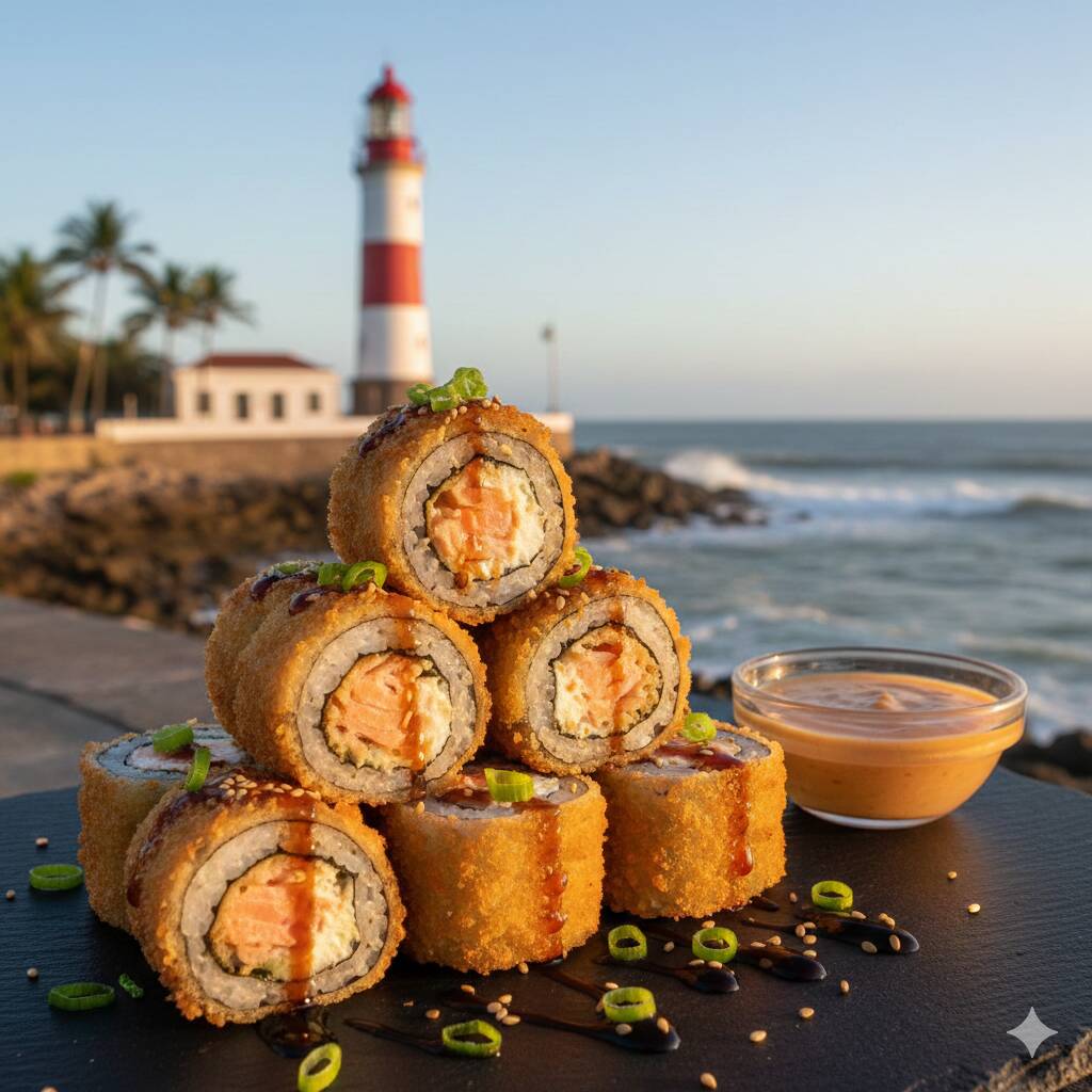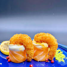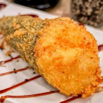ENVOLTO DE ARROZ NO NORI REVESTIDO COM SALMÃO CRUE CREAM CHEESE, LEVEMENTE EMPANADO NA FARINHA PANКО FRITO EM OLÉO ESPECIAL.