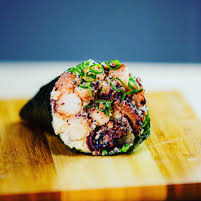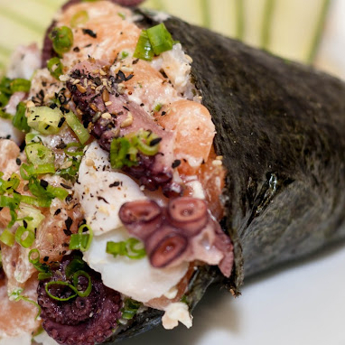 NORI COM ARROZ REVESTIDO COM SALMÃO, POLVO, PIMENTA SRIRACHA, CEBOLIINHA E CREAM CHEESE.