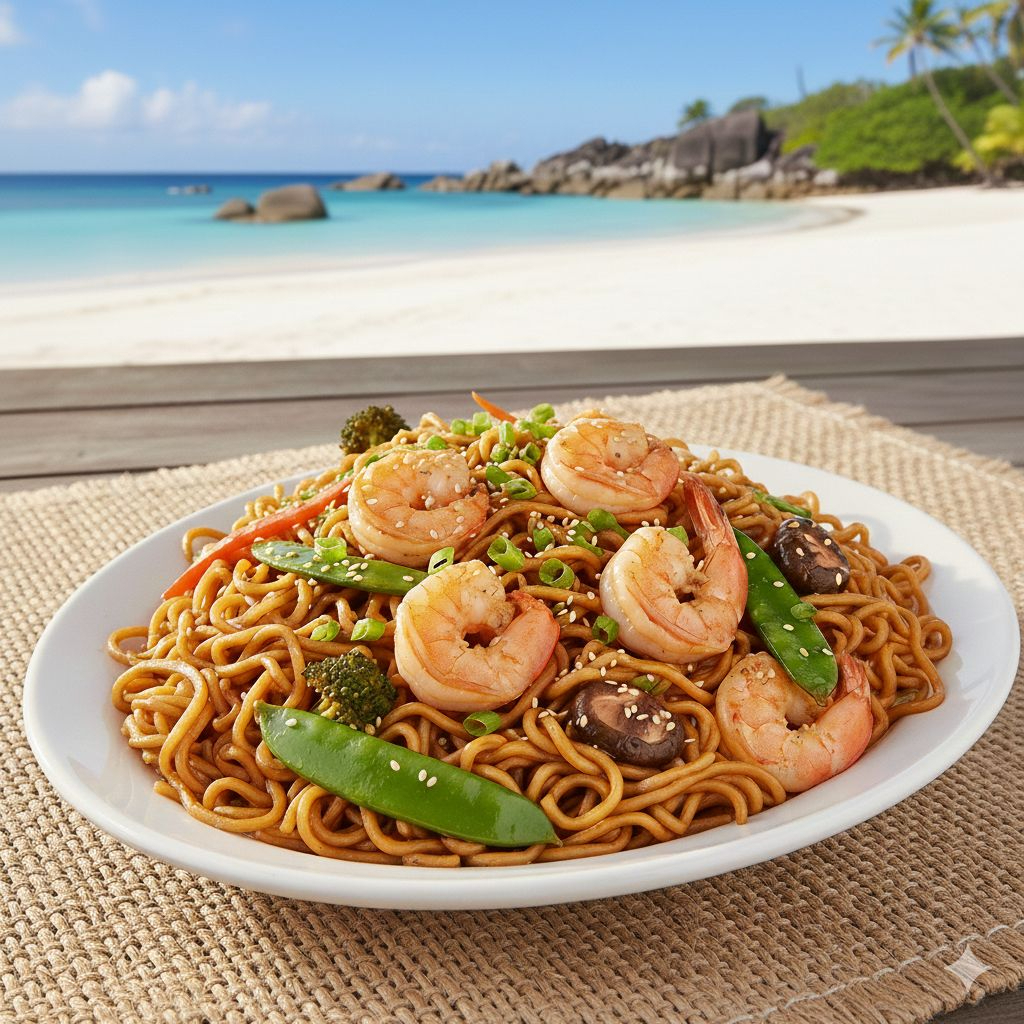 MACARRÃO ARTESENAL, ACOMPALHADO COM FILÉ DE CAMARÃO, LEGUMES FRESCOS E MOLHO DO CHEF.