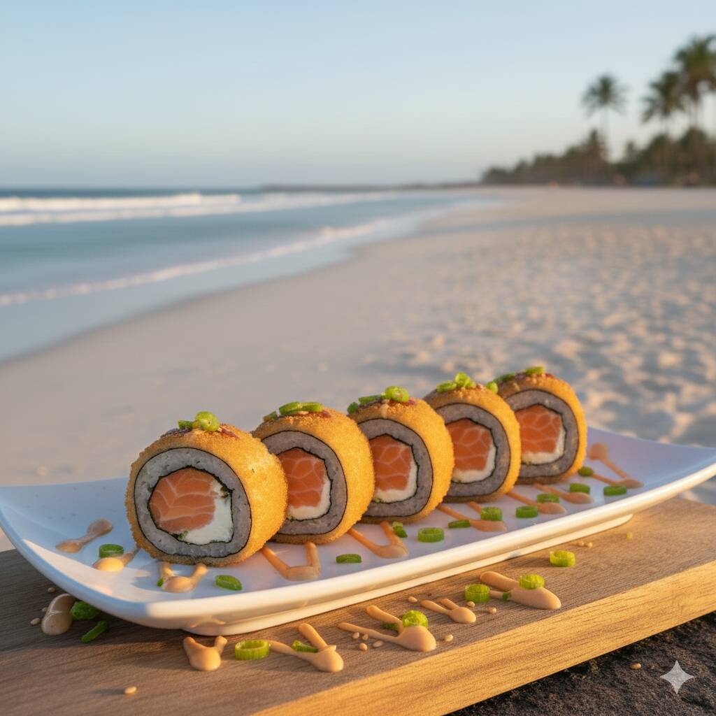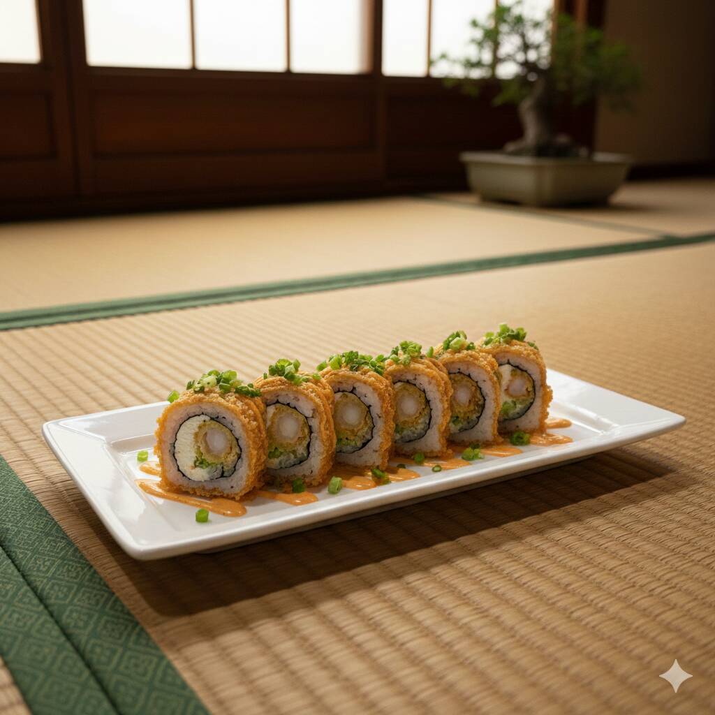 ENVOLTO DE ARROZ NO NORI REVESTIDO COM CAMARÃO, E CREAM CHEESE, LEVEMENTE EMPANADO NA FARINHA PANKO FRITO EM OLÉO ESPECIAL.