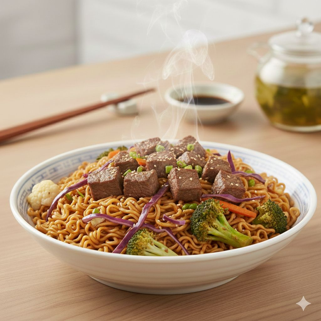 MACARRÃO ARTESENAL, ACOMPALHADO COM SULCULENTOS CUBOS DE CARNE, LEGUMES FRESCOS E MOLHO DO CHEF.