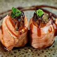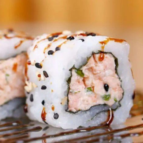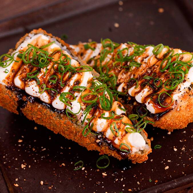 ENVOLTO DE ARROZ NO NORI, REVESTIDO COM SALMÃO CRU E CREAM CHEESE, LEVEMENTE EMPANADO NA FARINHA PANКО, REGADO AO MOLHO ESPECIAL.
