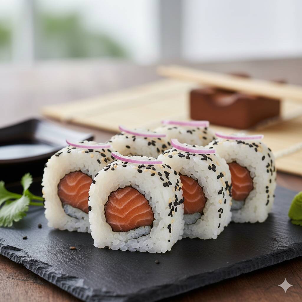 SALMÃO CRU, ARROZ, CEBOLINHA, CREAM CHEESE.