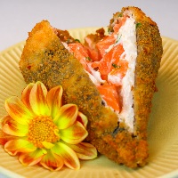 NORI COM ARROZ RESVESTIDO COM SALMÃO GRELHADO, CEBOLINHA E CREAM CHEESE, EMPANADO E FRITO.