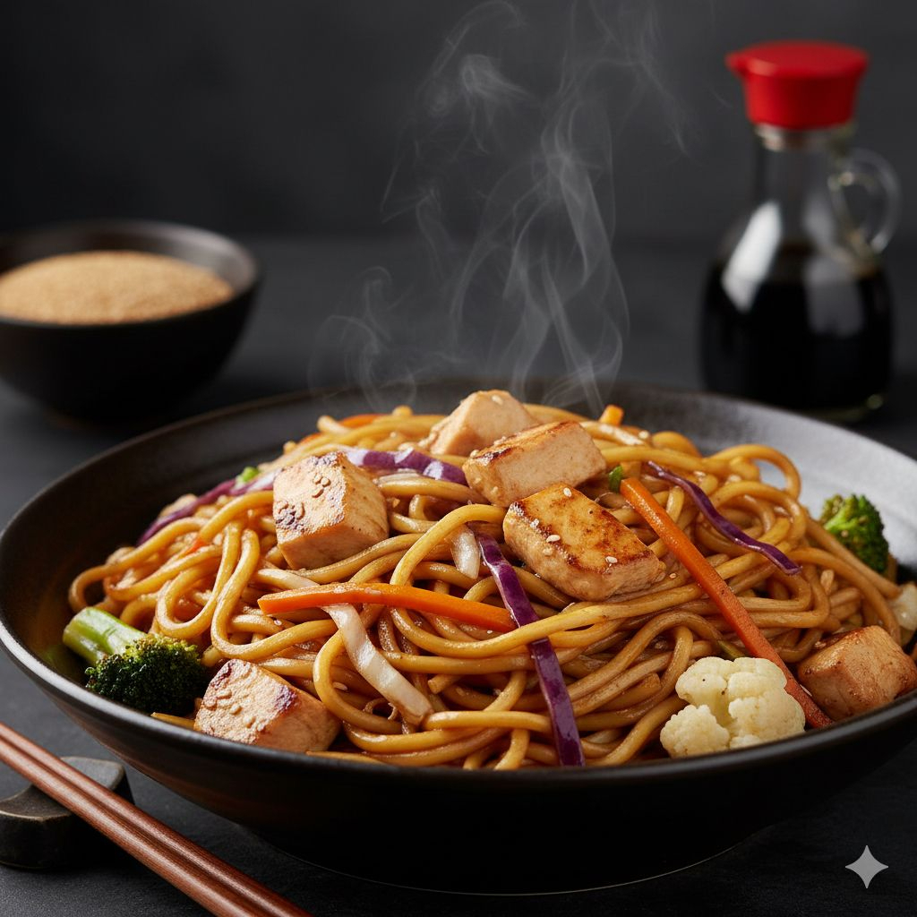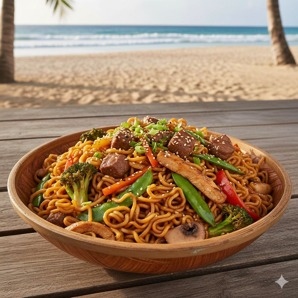 MACARRÃO ARTESENAL, ACOMPALHADO COM SULCULENTOS CUBOS DE FRANGO, CARNE ,LEGUMES FRESCOS E MOLHO DO CHEF.