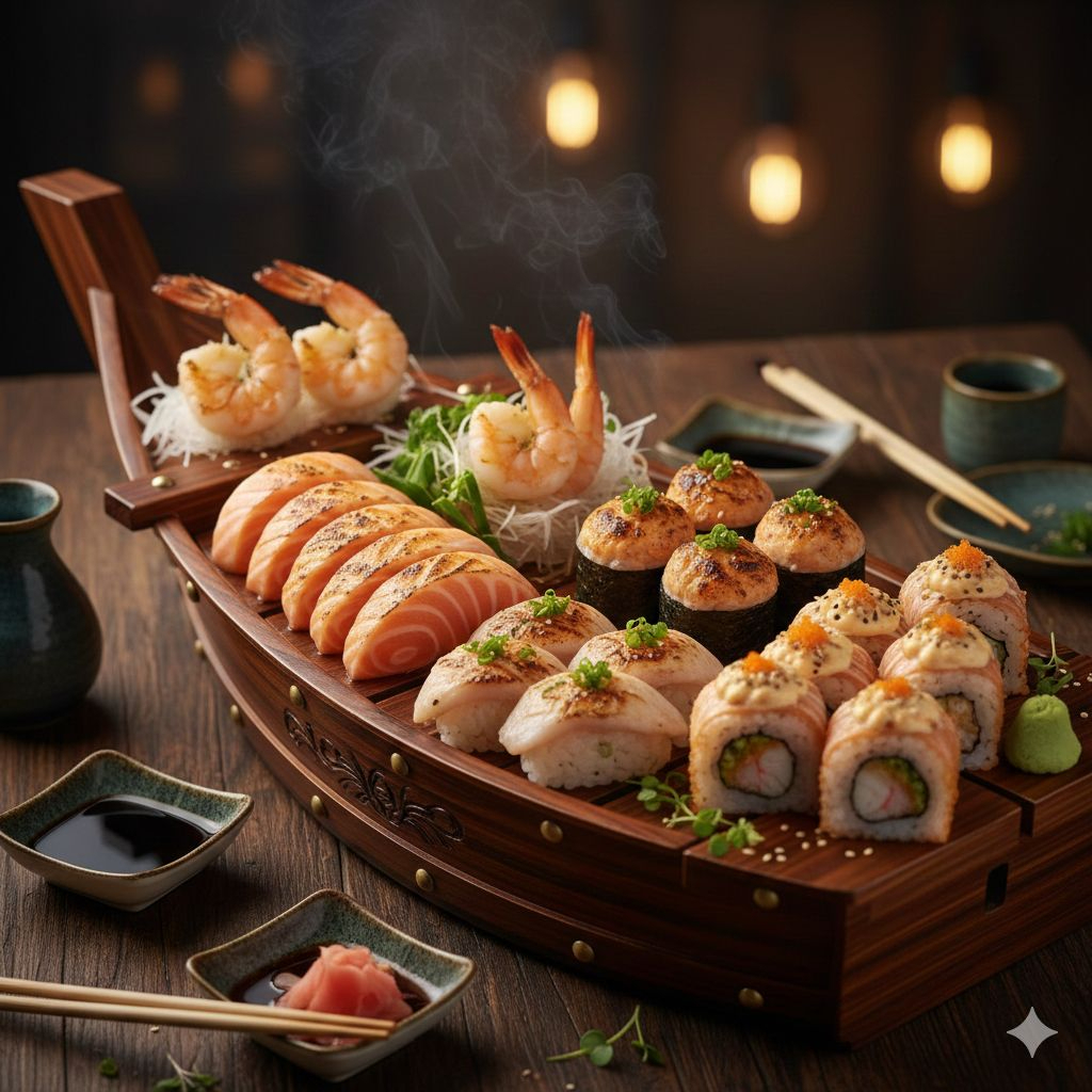 ACOMPANHADO DE SALMÃO, CAMARĀO, KANI, REGADO MOLHO DO CHEFE, FINALIZADO COM TEMPEROS CONTEMPORÂNEOS.