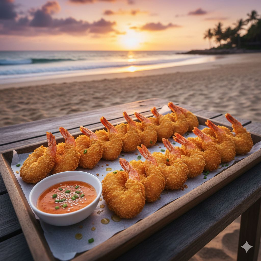 CAMARÕES SELECIONADOS EMPANADOS E FRITOS, ACOMPALHADO COM MOLHO DO CHEF.