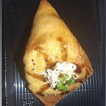 MASSA DE HARUMAKI COM ARROZ REVESTIDO COM SALMÃO GRELHADO, CEBOLINHAE CREAM CHEESE, EM FORMATO DE CONE E FRITO.