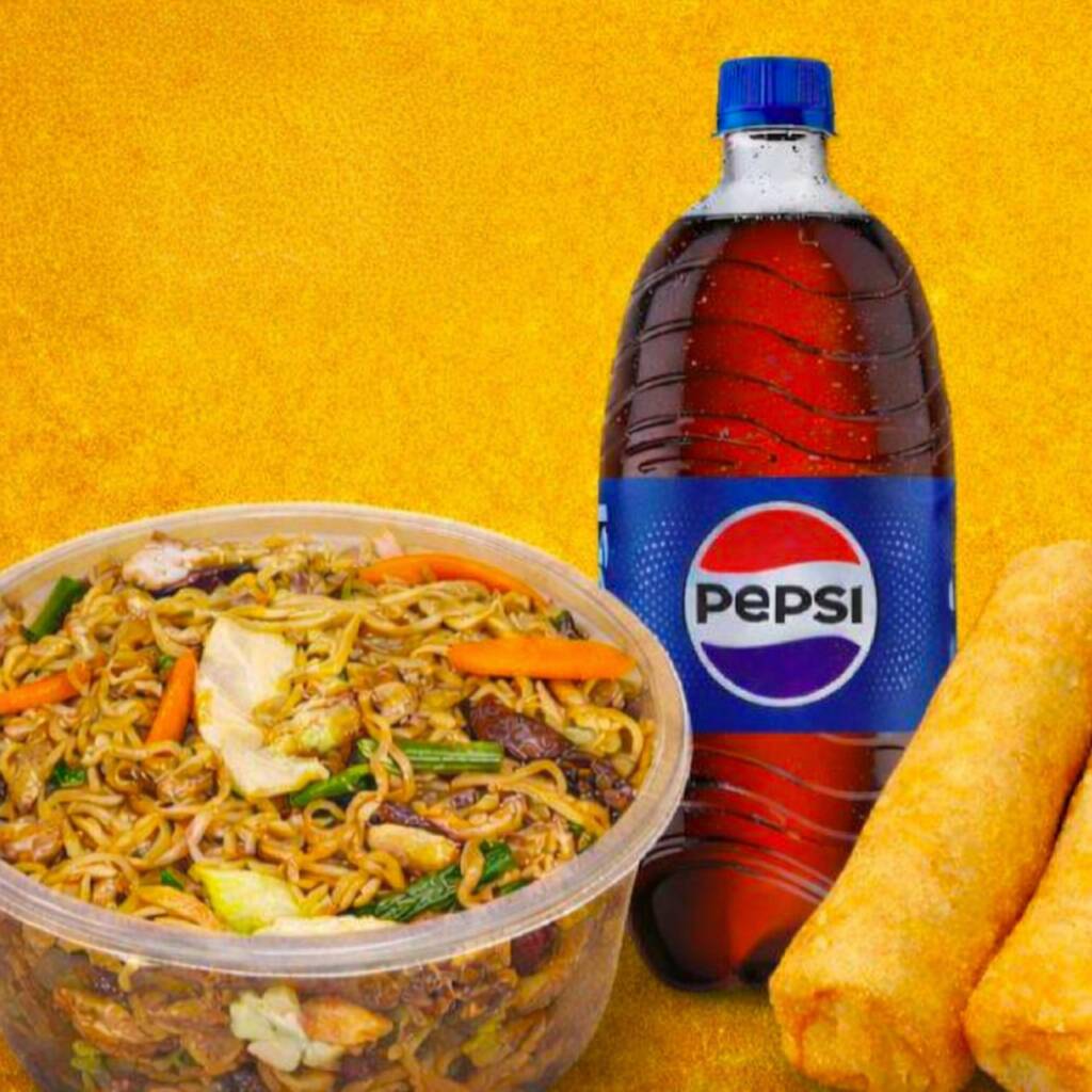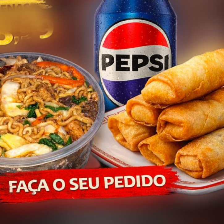 Acompanha um Yakissoba de aprox 500g + refrigerante em lata 350ml + 01 rolinho( pode ser queijo ou primavera)