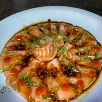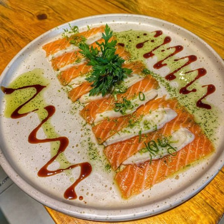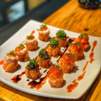 Puã de caranguejo com salmão, cream cheese e molhos especiais da casa.