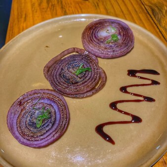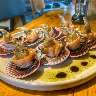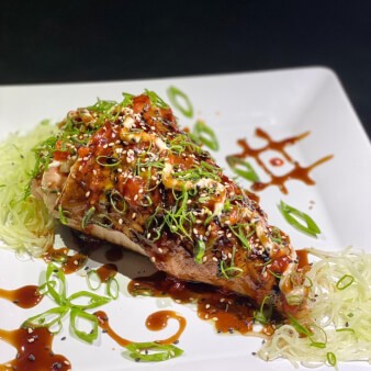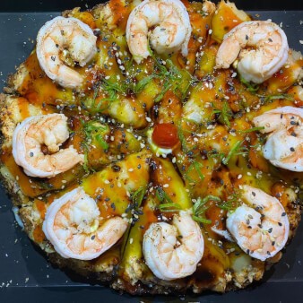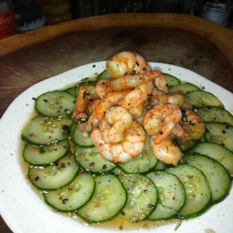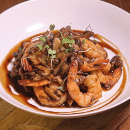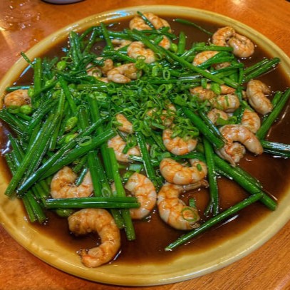 camarões grelhados, com nirá refogado a moda japonesa, cebolinha e gergelim.