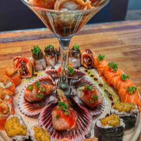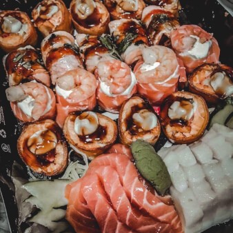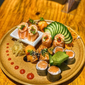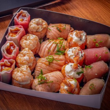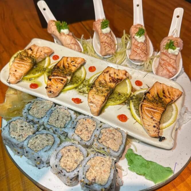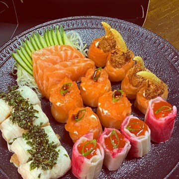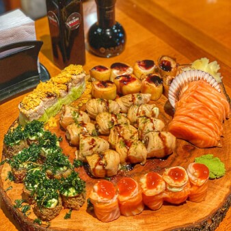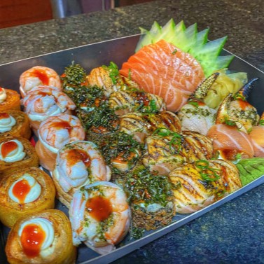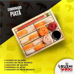 5 sashimi de salmão, 5 sashimi agulhão negro, 5 sashimi de atum, 2 niguiri de kani 4 california 2 niguiri salmão