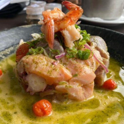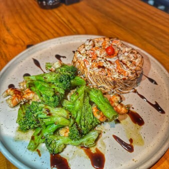 macarrão de yakissoba, legumes, salmão empanado, camarão, atum selado, agulhão negro e molhos especiais da casa.