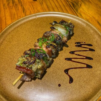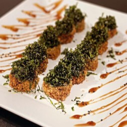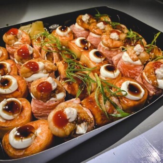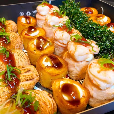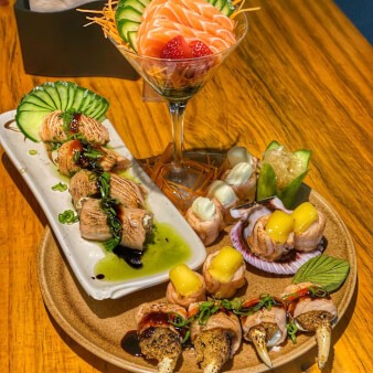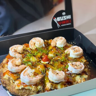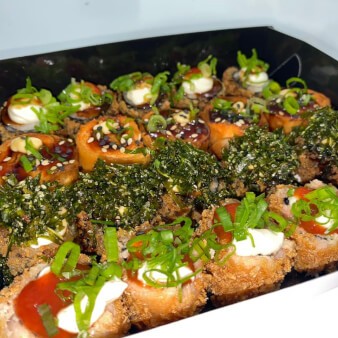 2- sushi yaki de camarão empanado, 2- sushi yaki de polvo 2- sushi yaki de shimeji,2- sushi yaki refogado ao molho secreto