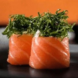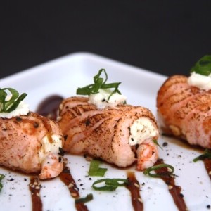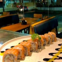 sushi especial de salmão com recheio de camarão refogado, cream cheese.