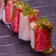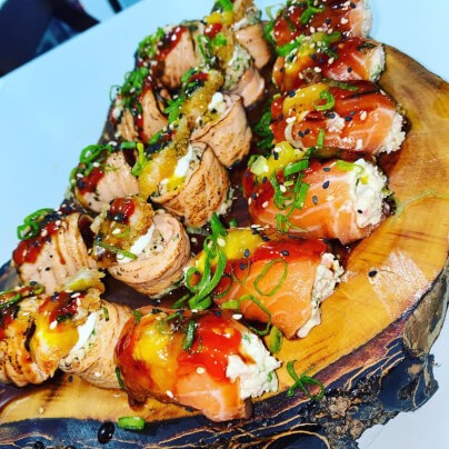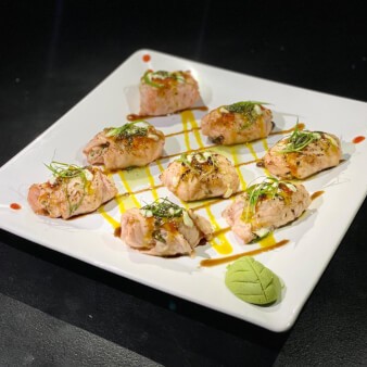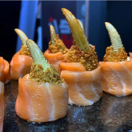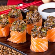 6 unidades de lamina de salmão maçaricado com recheio de camarão empanado e cream cheese.
