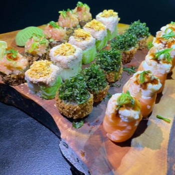 2 niguiri salmão, 2 niguiri de atum, 2 kani, 2 agulhão negro, 2 salmão skin.