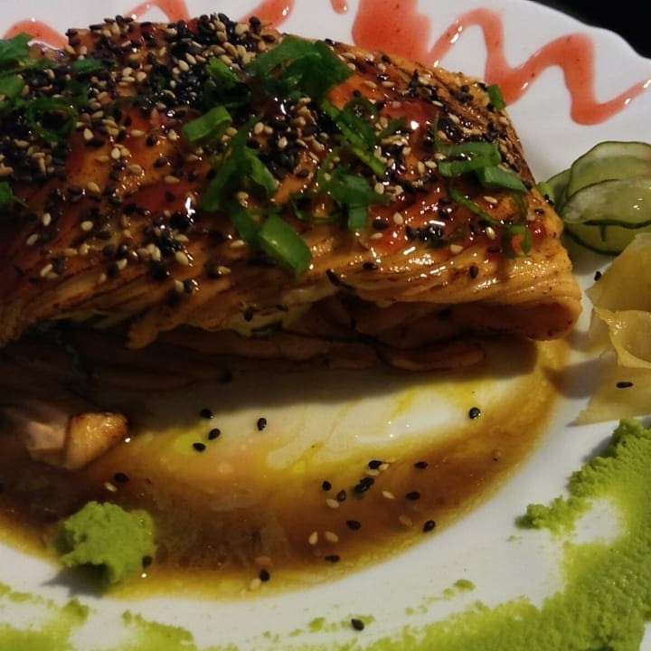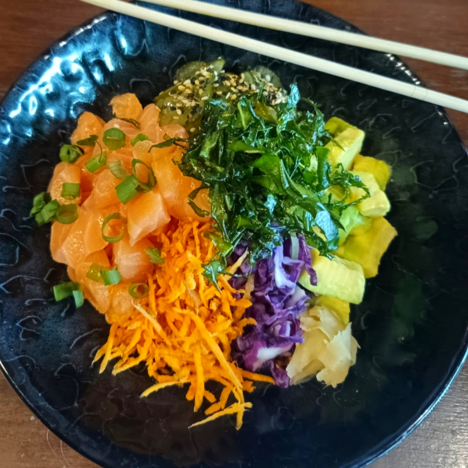Arroz+ Salmão+ abacate+ cenoura+repolho roxo+ sunomono+ crispy
