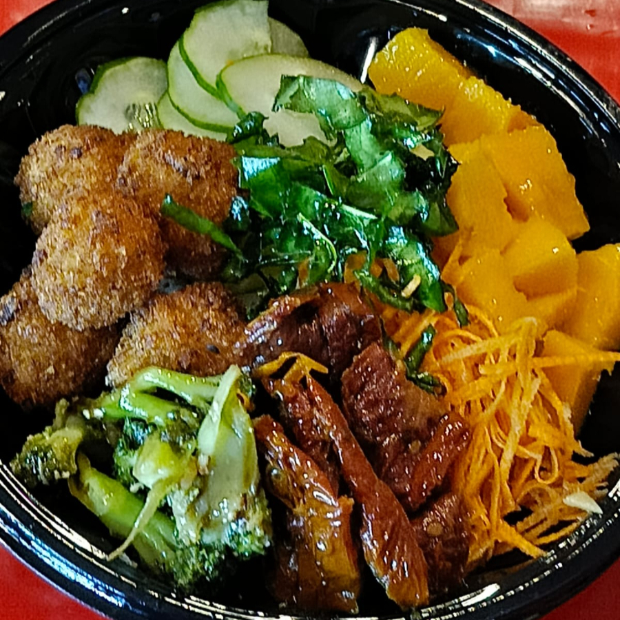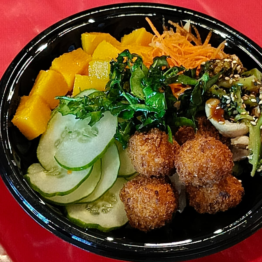 Arroz+ frango teriyak refogado com brócolis+ manga+ pepino+ cenoura+ bolinhas crocantes+ couve crispy