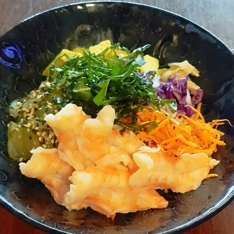 Arroz+ camarão filé+ sunomono+ cenoura+ repolho roxo+ abacate+ crispy de couve